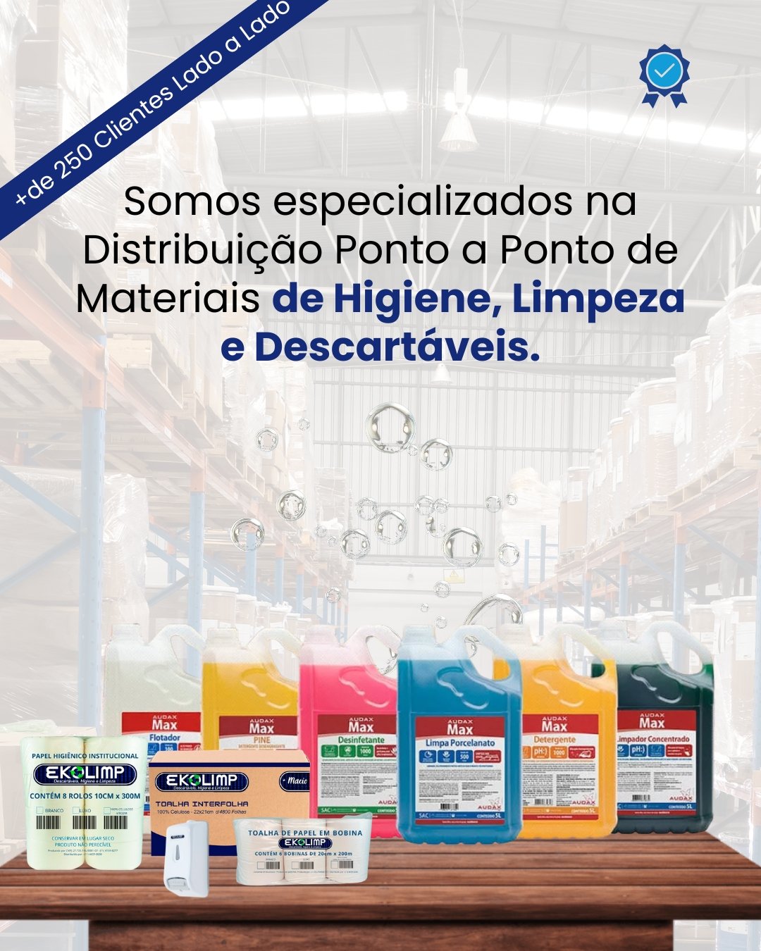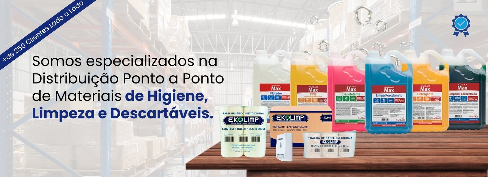 Com mais de 12 anos de experiência, a Ekolimp Descartáveis Ltda é referência na distribuição de materiais de limpeza, higiene e descartáveis. Atendemos com excelência empresas privadas de diversos segmentos e órgãos públicos, focados em simplificar e otimizar o fornecimento de suprimentos essenciais.